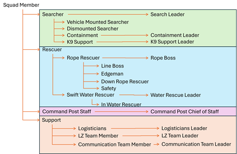 Associated with the Knowledge Base are teams and roles. SAR skills are not only classified into mission areas but also into teams and the individual roles within a team. Currently there are 15 teams and 29 roles defined. Each team and its associated roles are described in detail below.